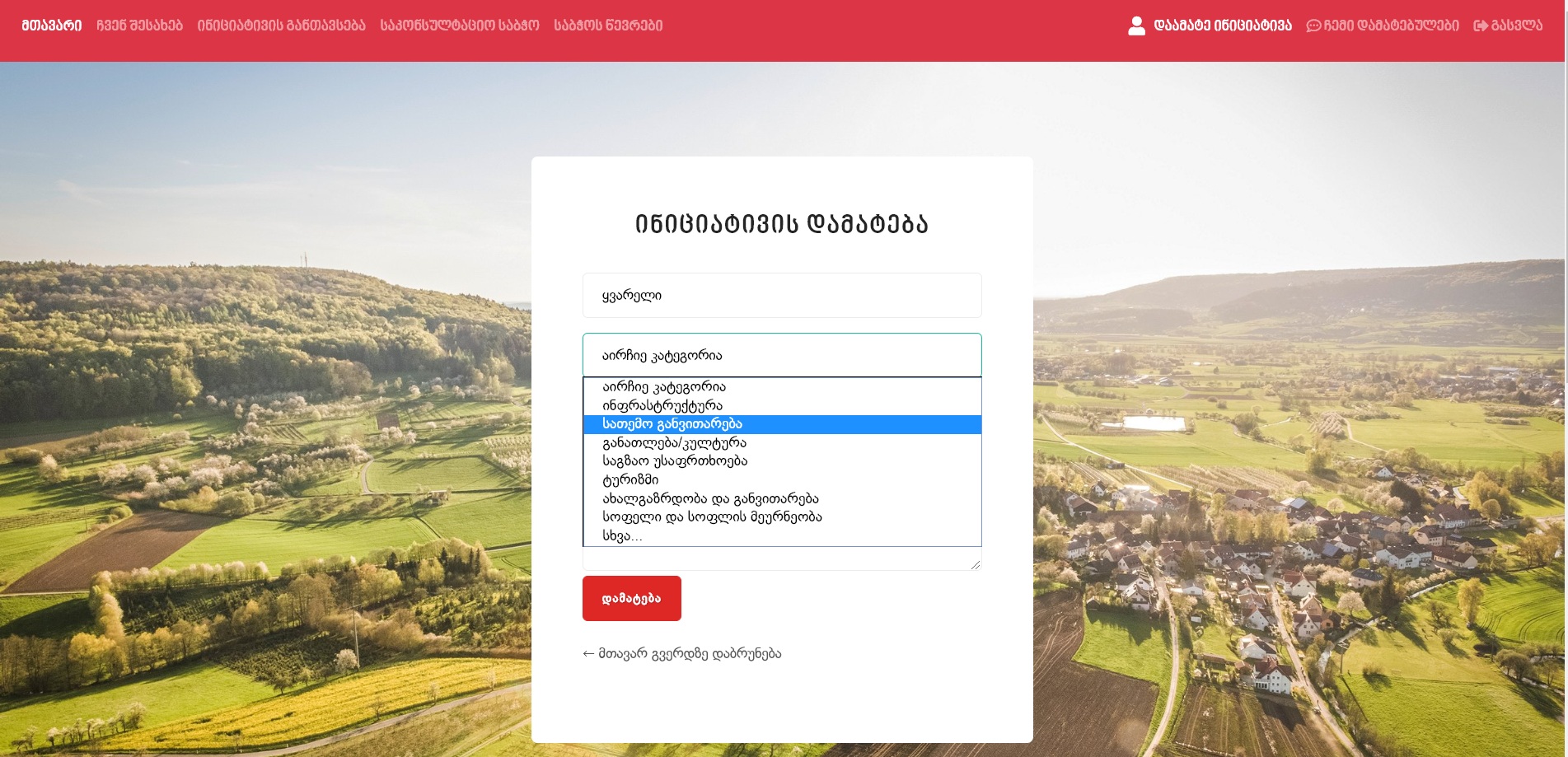 შეგიძლიათ ინიციატივა აირჩიოთ სასურველი კატეგორიიდან, გაეცნოთ სახელწოდებას, აღწერას